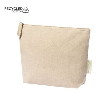 Neceser en resistente material 100% algodón reciclado GRS de 180g/m2. Certificación GRS (Global Recycled Standard / Estándar de Reciclaje Global), que garantiza el origen reciclado del material usado para fabricar el producto. Cierre de cremallera con tirador a juego y distintivo eco en etiqueta exterior.