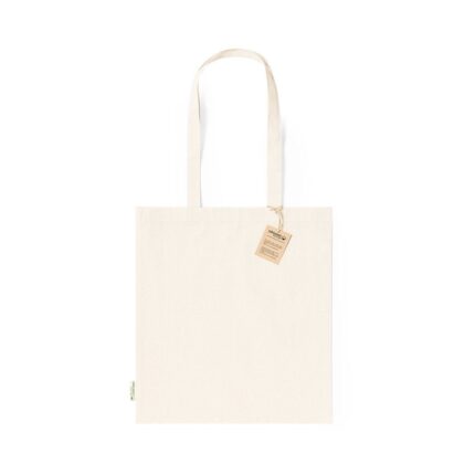 Bolsa fabricada en material100% algodón orgánico de 140g/m2 y en tono natural. Con certificación GOTS (Global Organic Textile Standard, ó Norma Mundial de Textiles Orgánicos) que garantiza que los tejidos están hechos de fibras orgánicas. De acabado cosido, con asas medianas reforzadas de 70 cm. Resistencia hasta 8kg, incluida etiqueta con distintivo de algodón orgánico y hangtag en cartón reciclado.