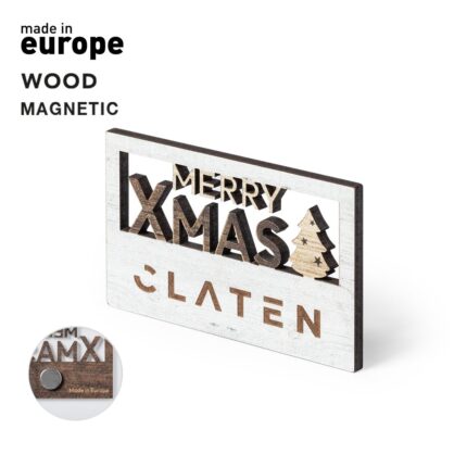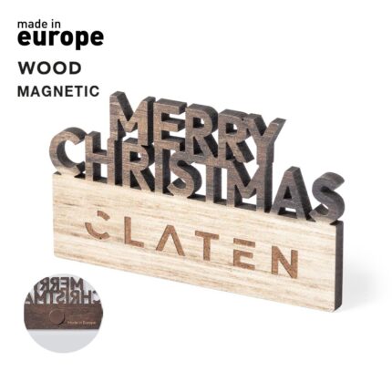 Original imán Merry Christmas fabricado en madera natural, con texto troquelado y de original acabado bicolor. Amplia superficie de marcaje y distintivo Made In Europe.