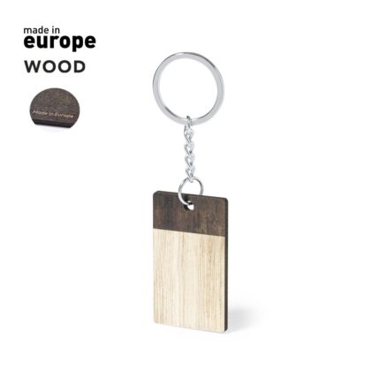 Llavero rectangular, fabricado en madera natural y de original acabado bicolor. Amplia superficie de marcaje, con anilla y cadena metálicas y distintivo Made In Europe.