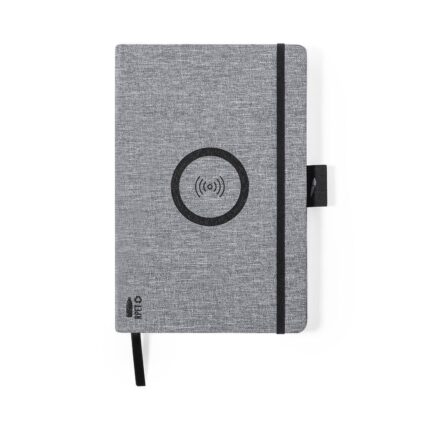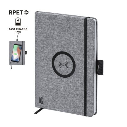 Bloc de notas cargador de línea nature en resistente poliéster 300D RPET de tamaño A5 y elaborado a partir de plástico reciclado, para así fomentar la reutilización de residuos plásticos y ayudar a la sostenibilidad del planeta. Con cargador inalámbrico de 10W integrado en la portada. Incluye 80 hojas con disposición a una raya. Compatible con smartphones con tecnología de carga inalámbrica. Incluido cable de carga Tipo C y disponible manual de instrucciones en español e inglés.