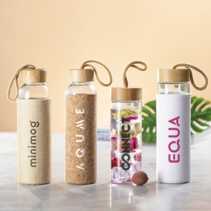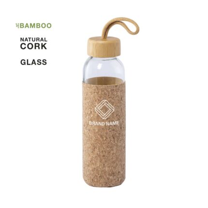 Bidón de línea nature de 540ml de capacidad. Fabricado con cuerpo de cristal y tapón a rosca de bambú. Incluye funda de silicona y viene presentado en caja individual de atractivo diseño.