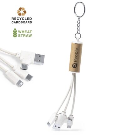 Cable cargador USB de línea nature, fabricado en combinación de cartón reciclado y caña de trigo, para así fomentar la utilización de materias primas naturales y reducir las emisiones contaminantes. Con conexiones USB, Tipo C y dual micro USB-Lightning. Con anilla/llavero para fácil transporte y zona lisa para marcaje. Presentado en bolsa individual autocierre de acabado kraft y diseño eco.