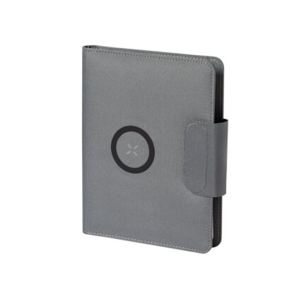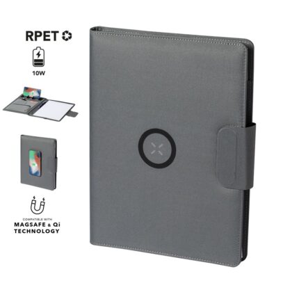Carpeta/bloc multifunción fabricada en poliéster 300D RPET, elaborado a partir de plástico reciclado, para así fomentar la reutilización de residuos plásticos y ayudar a la sostenibilidad del planeta. Con cierre magnético y etiqueta interior con distintivo RPET. Incluye cargador inalámbrico 10W integrado en portada, con fijación magnética para poder usar el dispositivo mientras se produce la carga del mismo e incluyendo anillo adhesivo, válido para todos los dispositivos con tecnología Magsafe y Qi.Batería integrada de 5.000 mAh de capacidad de carga, con puerto Tipo C de entrada/salida y LEDs indicadores de estado de carga, con cable incluido.Interior con soporte para smartphone y multitud de compartimentos para tarjetas, incluidos soporte para bolígrafo y bloc A4 con 20 hojas de disposición a una raya. Presentada en atractiva caja individual de diseño.Las capacidades mostradas en todas nuestras baterías auxiliares externas son reales, incorporando todas ellas baterías de grado A y no recicladas, con una vida útil de al menos 500 ciclos de carga y según normativa CE. Además, están fabricadas conforme a los estándares RoHS y en cumplimiento con los siguientes requisitos de seguridad: Sistema de protección contra sobrecarga del power bank. Sistema de protección contra descarga completa que proporciona una mayor durabilidad del power bank. Sistema de bloqueo para evitar cortocircuitos. Sistema de transferencia de carga constante, acorde con la capacidad del dispositivo de destino.
