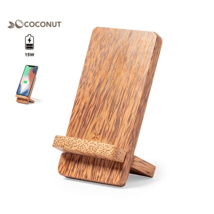 Cargador inalámbrico 15W de línea nature con función soporte para smartphone y fabricado en coco. Tras el consumo de su fruto, del coco y su planta se pueden obtener multitud de productos, contribuyendo a la sostenibilidad del planeta y fomentando el uso de materias primas naturales. Compatible con dispositivos equipados con tecnología de carga inalámbrica. Amplia superficie de marcaje y presentado en caja individual de diseño eco en cartón kraft.