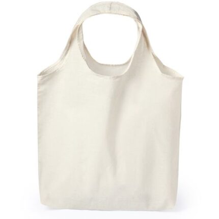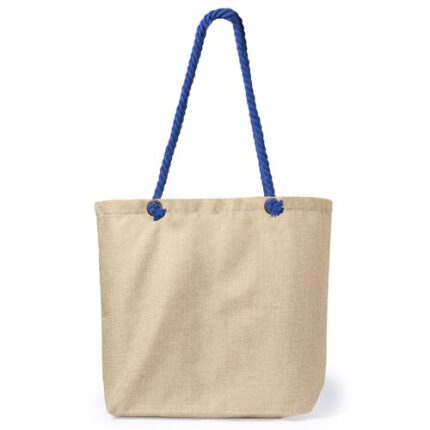 Bolsa en poliéster de acabado bicolor natural. Con asas largas para hombro reforzadas con argollas metálicas y fuelle. De acabado cosido y resistencia hasta 9kg de peso.