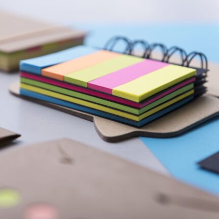 Libreta de anillas con tapas de suave tacto acabadas en resistente cartón reciclado y bolígrafo en cartón reciclado a juego. De atrevidos colores, 80 hojas lisas y con soporte para bolígrafo en contraportada.