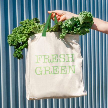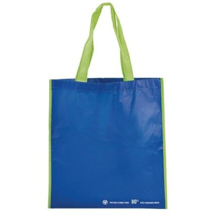 Bolsa en resistente material PET reciclado en variada gama de vivos colores brillantes. Con asas largas de 60cm en verde y reforzadas en nylon. Fuelle en verde reforzado con ribetes. De acabado cosido y resistencia hasta 12kg de peso.