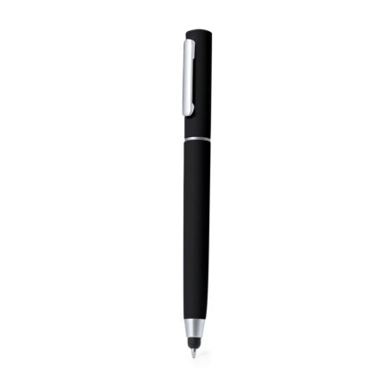 Práctico bolígrafo puntero de mecanismo giratorio, con accesorios de limpieza alojados en la parte superior de la caña. Incluye un cepillo y una punta metálica protegidos por una capucha. Con clip metálico y en tinta azul. Disponible en varios colores y presentado individualmente en caja de diseño kraft.