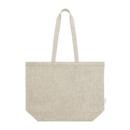 Bolsa de línea nature, fabricada en algodón reciclado de 140g/m2. De acabado cosido y con asas largas reforzadas (70 x 2,5cm). Fuelle en base y disponible en colores natural y negro, con distintivo algodón reciclado en etiqueta exterior. Resistencia hasta 6 kg de peso. Certificación GRS (Global Recycled Standard / Estándar de Reciclaje Global), que garantiza el origen reciclado del material usado para fabricar el producto