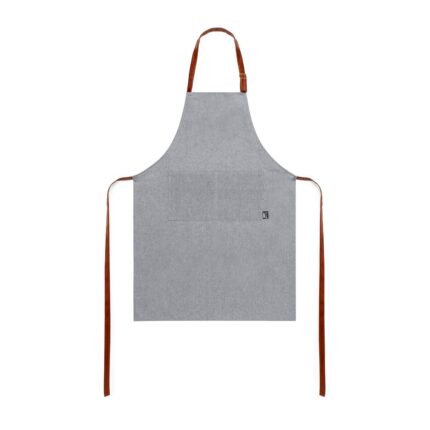 Delantal de línea nature en material RPET, elaborado a partir de plástico reciclado, para así fomentar la reutilización de residuos plásticos y ayudar a la sostenibilidad del planeta. De corte por debajo de la rodilla, con cintas de ajuste en resistente polipiel y amplio bolsillo frontal. Etiqueta en bolsillo con distintivo RPET.