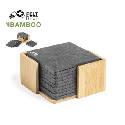 Set de 10 posavasos de línea nature. Fabricados en fieltro RPET reciclado, fruto de la combinación del proceso de reciclaje de materiales plásticos junto con la técnica milenaria de fabricación del fieltro, dando como resultado un material de eco-tendencia que, además de ser de origen reciclado, también se convierte en reciclable. Soporte fabricado en bambú y posavasos con distintivo RPET. Set presentado en caja individual de diseño kraft.