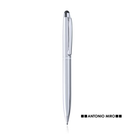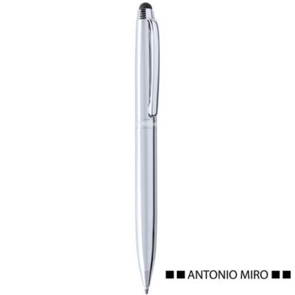 Bolígrafo puntero de Antonio Miró de mecanismo giratorio con suave cuerpo metálico, de elegante color plateado. Clip de diseño a juego. Presentado en estuche individual negro con logotipo de la marca. Tinta azul.