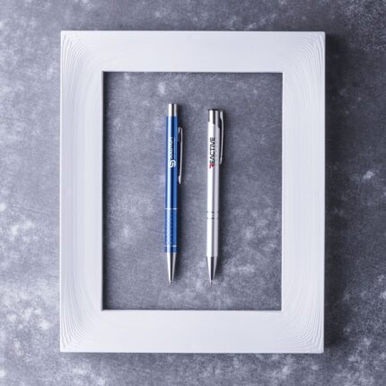 Bolígrafo puntero de mecanismo giratorio con cuerpo en aluminio de color blanco y accesorios en variada gama de vivos colores. Con clip troquelado y tinta azul.
