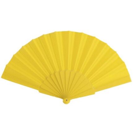 Abanico de varillas de plástico y tela en poliéster de variados colores. Presentado en caja individual con ventana.