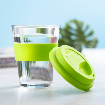 Vaso de cristal y 350ml de capacidad. Con tira antiquemaduras y tapa de silicona a juego en variada gama de colores. Presentado en caja individual de atractivo diseño.