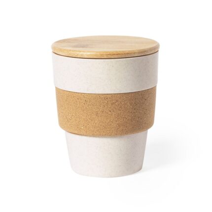 Vaso de línea nature de 350 ml de capacidad. Fabricado en PP veteado, con banda exterior en corcho natural y tapa fabricada en bambú. Con certificación Food Grade, garantizando la seguridad cuando los alimentos entran en contacto con el material usado para fabricar el producto. Presentado en atractiva caja de diseño eco.