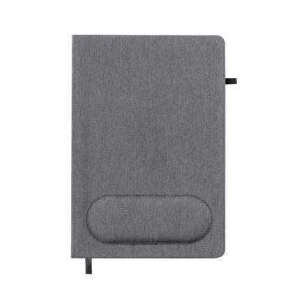 Libreta alfombrilla elaborada en RPET 300D con tapas rígidas. Destaca por su original soporte en la portada con forma ergonómica para la muñeca y así poder usarse como alfombrilla de ratón. Incluye marcapáginas y un soporte para bolígrafo a juego. Contiene 100 hojas interiores lisas y está disponible en un elegante color gris. Con logotipo RPET en contraportada y presentada en bolsa individual reciclada..El material RPET se elabora a partir de plástico reciclado, para así fomentar la reutilización de residuos plásticos y ayudar a la sostenibilidad del planeta.