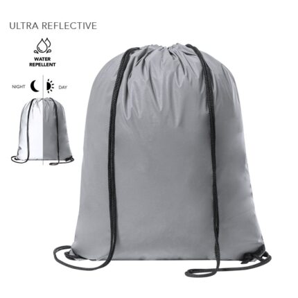 Mochila de cuerdas de suave poliéster 210T. Fabricada empleando tejido con gran capacidad para reflejar intensamente la luz, gracias a millones de pigmentos reflectantes y basándose en el principio de la retro-reflexión de la luz, una propiedad de visibilidad nocturna que consiste en la refracción de la luz hacia la fuente de origen de la misma. Con cuerdas autocierre en color negro y argollas metálicas. Resistencia hasta 7kg de peso y resistente al agua.