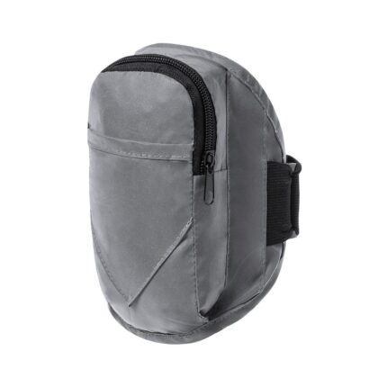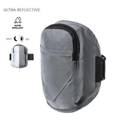 Brazalete deportivo en poliéster 210T, fabricado empleando tejido con gran capacidad para reflejar intensamente la luz, gracias a millones de pigmentos reflectantes y basándose en el principio de la retro-reflexión de la luz, una propiedad de visibilidad nocturna que consiste en la refracción de la luz hacia la fuente de origen de la misma. Bolsillo principal con cierre de cremallera y bolsillo frontal con cierre de velcro. Con tira ajustable elástica y resistente al agua.