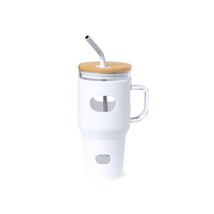 Tarro de gran capacidad (1,1 l) con cuerpo fabricado en resistente cristal, que ofrece una resistencia y durabilidad excepcionales, alargando su vida útil y pudiendo ser reutilizado infinidad de veces. Incluye asa para cómodo transporte y funda protectora en suave silicona. Tapa en bambú a presión, con orificio para pajita, y pajita reutilizable de acero inoxidable, con la punta recubierta en silicona para disfrutar de las bebidas de manera cómoda y segura. Presentado en caja individual de diseño kraft.