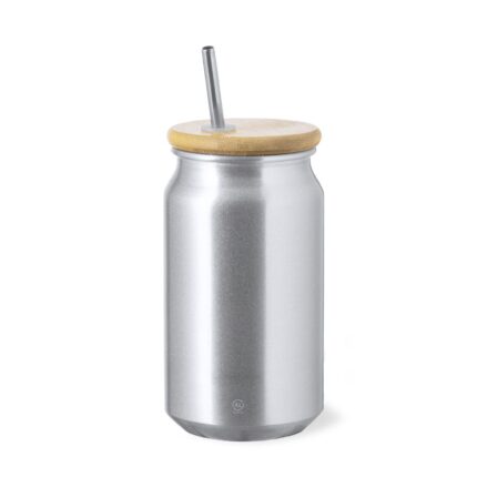 Vaso de 430 ml de capacidad. Fabricado en elegante y sostenible aluminio reciclado. Con tapón de bambú a presión con orificio para pajita y pajita reutilizable de acero inoxidable. Con distintivo de Aluminio Reciclado. Presentación individual en una caja de diseño kraft y en una bolsa reciclada. El aluminio reciclado es un material con posibilidades de reciclaje casi infinitas, sin perder sus propiedades originales y consumiendo menos energía en este proceso. Certificación GRS (Global Recycled Standard / Estándar de Reciclaje Global), que garantiza el origen reciclado del material usado para fabricar el producto.