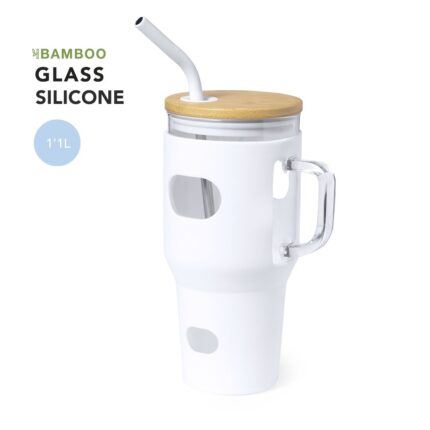 Tarro de gran capacidad (1,1 l) con cuerpo fabricado en resistente cristal, que ofrece una resistencia y durabilidad excepcionales, alargando su vida útil y pudiendo ser reutilizado infinidad de veces. Incluye asa para cómodo transporte y funda protectora en suave silicona. Tapa en bambú a presión, con orificio para pajita, y pajita reutilizable de acero inoxidable, con la punta recubierta en silicona para disfrutar de las bebidas de manera cómoda y segura. Presentado en caja individual de diseño kraft.