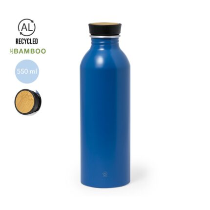 Bidón de 550 ml de capacidad. Fabricado en elegante y sostenible aluminio reciclado. De acabado satinado, incluye original tapón a rosca con detalle de bambú y libre de BPA. Con distintivo Aluminio Reciclado. Presentado en caja de diseño kraft y en bolsa individual reciclada. El aluminio reciclado es un material con posibilidades de reciclaje casi infinitas, sin perder sus propiedades originales y consumiendo menos energía en este proceso.