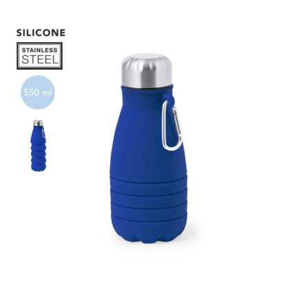 Bidón plegable de 550 ml de capacidad. Fabricado en silicona de alta calidad con tapón de acero inoxidable. Con cuerpo flexible de acabado mate, este bidón puede ser plegado para un cómodo y sencillo almacenamiento. Incluye mosquetón para fácil transporte. Libre de BPA. Disponible en variada gama de colores. Presentado en bolsa individual reciclada. Medidas plegado: Ø7,1 cm x 16,9 cm de alto. Medidas desplegado Ø7,1 cm hasta 24,8 cm de alto.