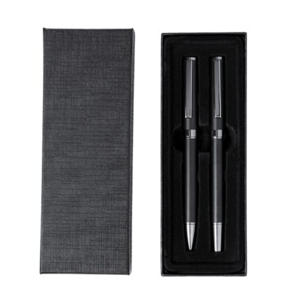 Elegante set de bolígrafo y roller. Bolígrafo de mecanismo giratorio y roller con capucha, ambos provistos de un clip metálico. Con tinta azul, su cuerpo presenta un elegante acabado negro mate y sutiles detalles cromados. Presentados en un estuche kraft negro, con interior troquelado en tacto de terciopelo.