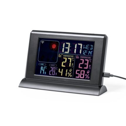 Estación meteorológica premium multifunción, fabricada en resistente ABS de acabado negro satinado. Incluye pantalla retroiluminada, de fácil lectura y con gráficos en color. Con sensor inalámbrico para temperatura/humedad exterior y sensor integrado para temperatura/humedad interior. Funciones alarma y calendario, con APP disponible -compatible con iOS/ Android- para control remoto a través de red WiFi y funciones extra. Adaptador de corriente y cable USB incluido de 1 m de largo, con soporte para montaje en la pared. Sensor externo con alimentación a pilas (2xAAA no incluidas). Presentación en caja individual de diseño kraft, con manual de instrucciones en español e inglés.