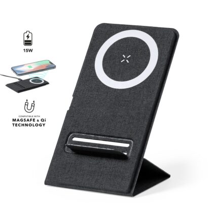 Cargador inalámbrico 15W. Fabricado en resistente poliéster 300D y con fijación magnética para poder usar el dispositivo mientras se produce la carga del mismo e incluyendo anillo adhesivo. Válido para todos los dispositivos con tecnología Magsafe y Qi. Plegado de pequeño tamaño para fácil transporte y presentado en atractiva caja individual de diseño.