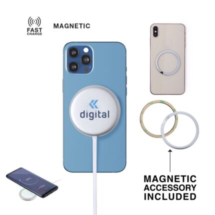 Cargador inalámbrico magnético 10W. Carcasa fabricada en resistente aluminio de acabado plateado. Con indicador de estado de carga y cable USB de 1m con conector de aluminio. Incluye accesorio metálico con adhesivo 3M, de fijación extra fuerte y libre de residuo al despegarlo del dispositivo, permitiendo así el uso de la función magnética del cargador en cualquier dispositivo móvil. Compatible con terminales equipados con tecnología de carga inalámbrica. Amplia superficie de marcaje y presentado en atractiva caja de diseño. Disponible manual de instrucciones en español e inglés.