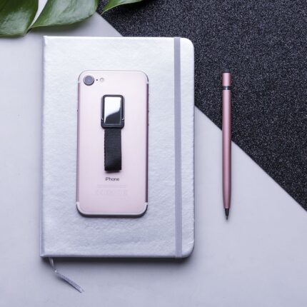 Original soporte adhesivo para smartphone con cinta para selfies en resistente poliéster y pastilla central para marcaje. Con soporte metálico y presentado en atractiva bolsita de diseño.