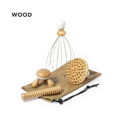 Set de masaje fabricado en madera natural. Contenido: Masajeador con mango en madera natural y patas metálicas, con suaves terminaciones de goma y efecto más que relajante. Masajeador cilindro para pies. Masajeador para espalda con 3 patas. Masajeador con multitud de puntos de masaje. Bolsa a juego, con cierre de cordón y bola de ajuste. Presentación en caja individual de diseño kraft.