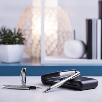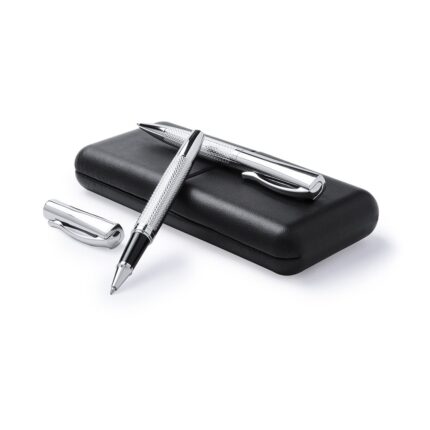 Elegante set de bolígrafo de mecanismo giratorio y roller de capucha en sobrio diseño. De cuerpo metálico antideslizante en acabado plateado brillante con clip a juego. Presentado en elegante y original estuche individual de polipiel en color negro con interior troquelado en suave antelina blanca. De cartucho jumbo con tinta azul de calidad alemana.