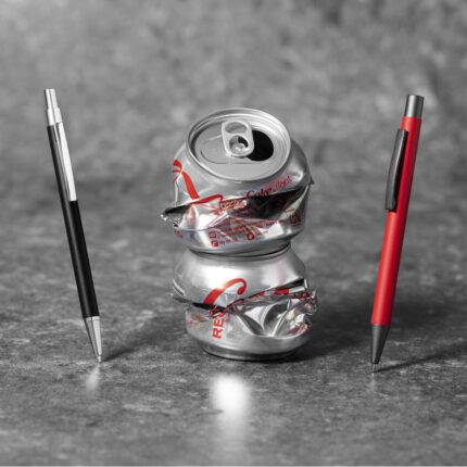 Bolígrafo eco-friendly fabricado en aluminio reciclado, cuyo origen se encuentra en la reutilización casi infinita de uno de los materiales con mayor potencial de reciclabilidad sin perder sus propiedades. Esta característica lo convierte en un material eco-friendly de origen reciclado, fácilmente reciclable y de cuyos procesos de tratamiento y desechos para la obtención del material se pueden obtener nuevos recursos reutilizables, consumiendo menos energía en su fabricación, entre otros factores de sostenibilidad. De mecanismo pulsador, con cuerpo disponible en variada gama de colores metalizados y accesorios en acabado gun. Clip metálico, tinta azul y distintivo aluminio reciclado en la parte superior del bolígrafo. Certificación GRS (Global Recycled Standard / Estándar de Reciclaje Global), que garantiza el origen reciclado del material usado para fabricar el producto.