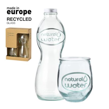 Set de de línea nature de 2 vasos de 400 ml y una botella de 1l. De fabricación europea y hechos en vidrio reciclado GRS. Botella con tapón a rosca metálico. Set presentado en estuche de cartón reciclado con ventana. La certificación GRS (Global Recycled Standard / Estándar de Reciclaje Global), garantiza el origen reciclado del material usado para fabricar el producto.