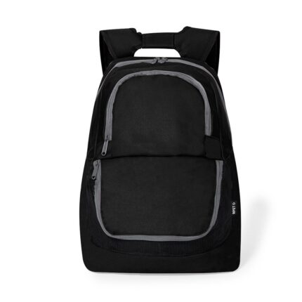 Mochila fabricada en resistente poliéster, dotada de cierre de cremallera de doble tirador y un bolsillo frontal. En su interior, dispone de compartimento acolchado para portátil hasta 15 pulgadas y compartimento para tablet de hasta 10 pulgadas. En el exterior, cuenta con un bolsillo frontal de acceso rápido y otro oculto en la espalda acolchada para guardar objetos de valor, incorporando una cinta para fijarla a las maletas. Sus esquinas reforzadas aportan durabilidad, e incluye asa de transporte, con elegantes accesorios en tono negro. Las cintas de hombros y la espalda son acolchadas y ajustables para mayor comodidad. Presentado en una bolsa individual reciclada.
