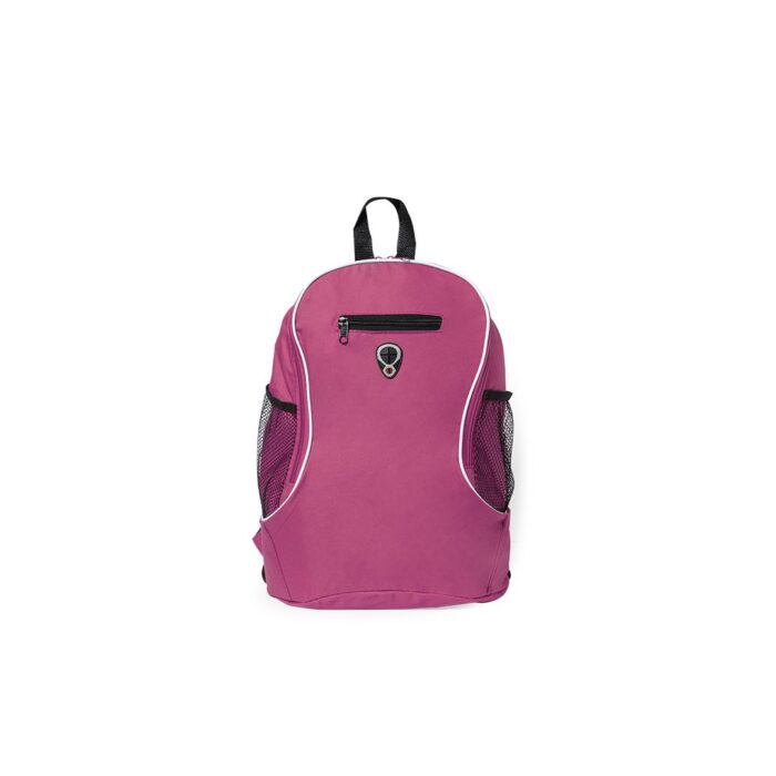 Mochila en resistente poliéster 600D de desenfadado diseño, con cierre de cremallera, salida para auriculares, bolsillo frontal y bolsillos elásticos de redecilla a los lados. Accesorios en color negro, con cintas de hombros ajustables con acolchado.