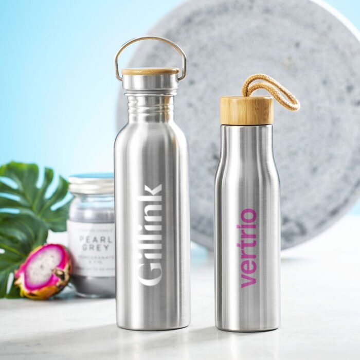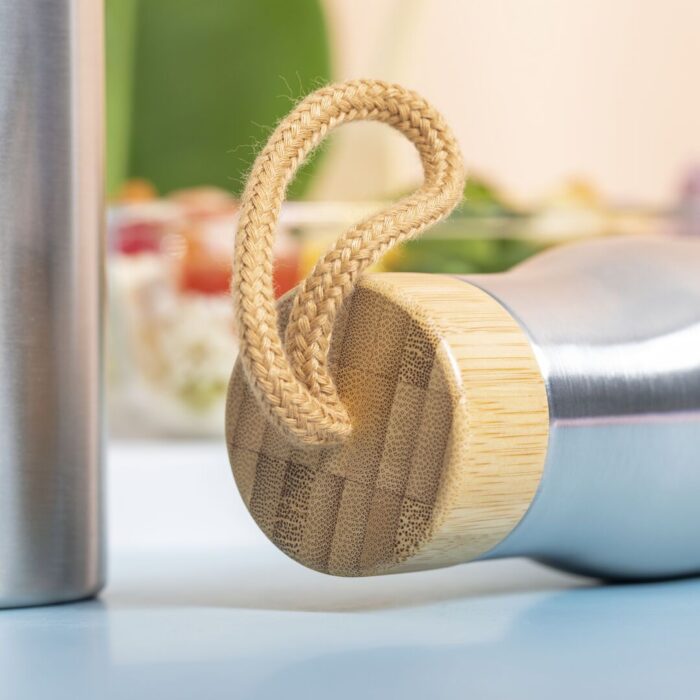 Bidón de línea nature y 600ml de capacidad. Cuerpo fabricado en acero inox y tapón en bambú con cinta de transporte. Libre de BPA y presentado en atractiva caja de diseño eco.