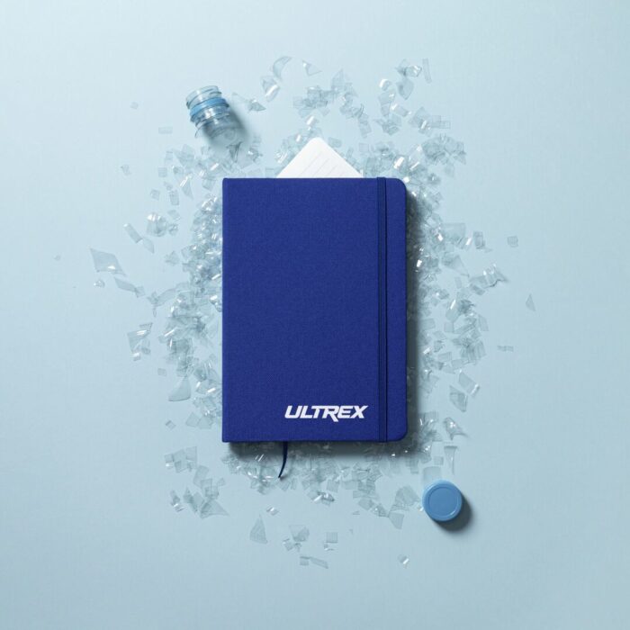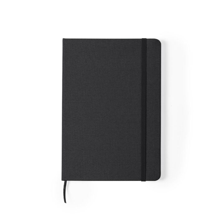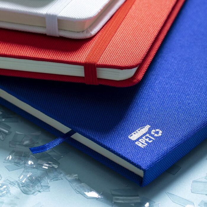 Bloc de notas de línea nature con tapas rígidas en 600D RPET, elaborado a partir de plástico reciclado para así fomentar la reutilización de residuos plásticos y contribuir a la sostenibilidad del planeta. Disponible en amplia gama de colores, incluye 80 hojas con disposición a una raya. Con elástico de sujeción y marcapáginas de tela a juego. Distintivo RPET en parte trasera.