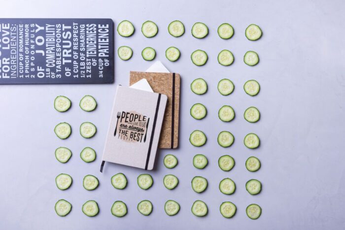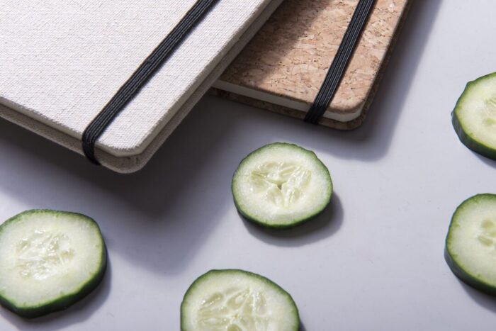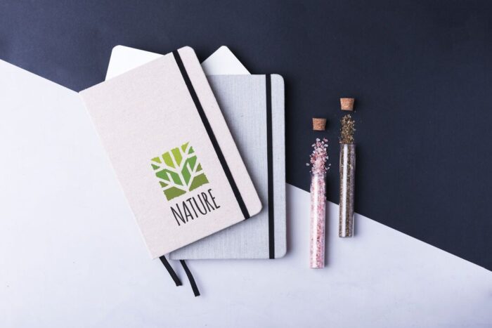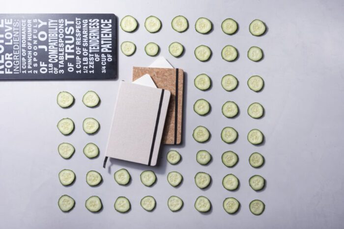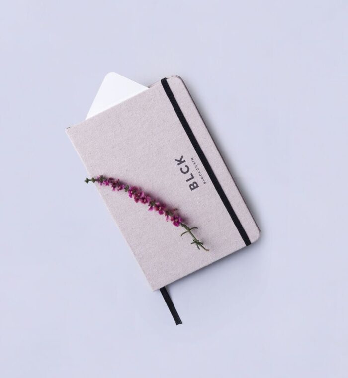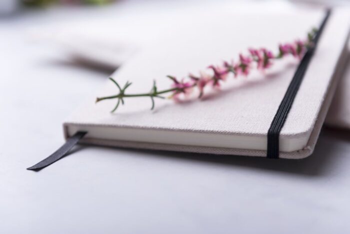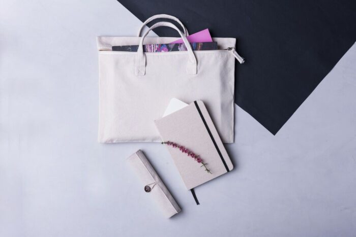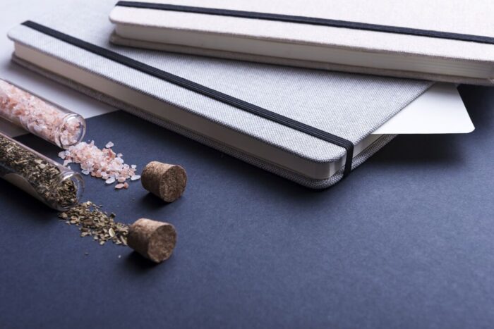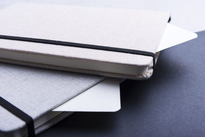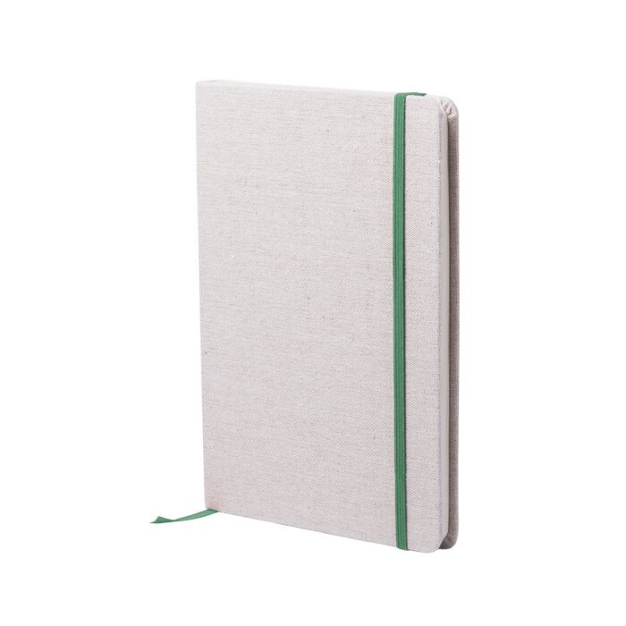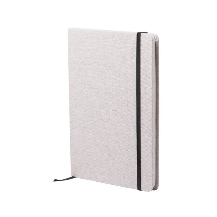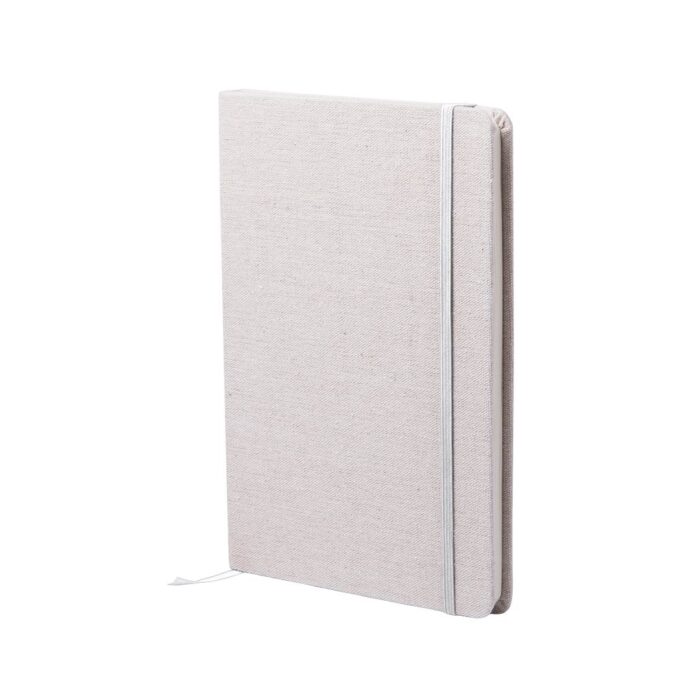 Bloc de notas de materiales naturales. Tapas en suave algodón de color crudo, con elástico de cierre y marcapáginas a juego en vivos colores. Incluye 80 hojas lisas.