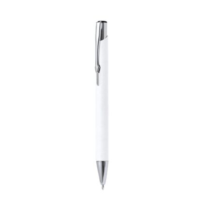 Elegante bolígrafo de mecanismo pulsador con cuerpo en papel reciclado y accesorios de acabado metálico en color plateado brillante. De tinta azul. Disponible en variada gama de colores.