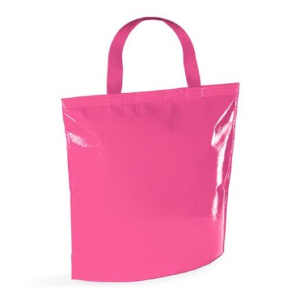 Bolsa en non-woven laminado de acabado brillante. En variada gama de vivos colores, con asas medianas reforzada de 48 cm de largo. De acabado cosido, con fuelles y ribetes reforzados.