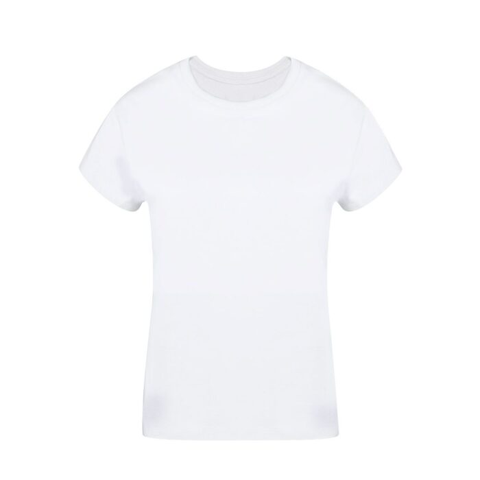Camiseta de mujer confeccionada en suave 100% algodón de 160g/m2. Con diseño tubular sin costuras lateras y cuello redondo. Disponible en color blanco y en tallas S, M, L, XL, XXL.
