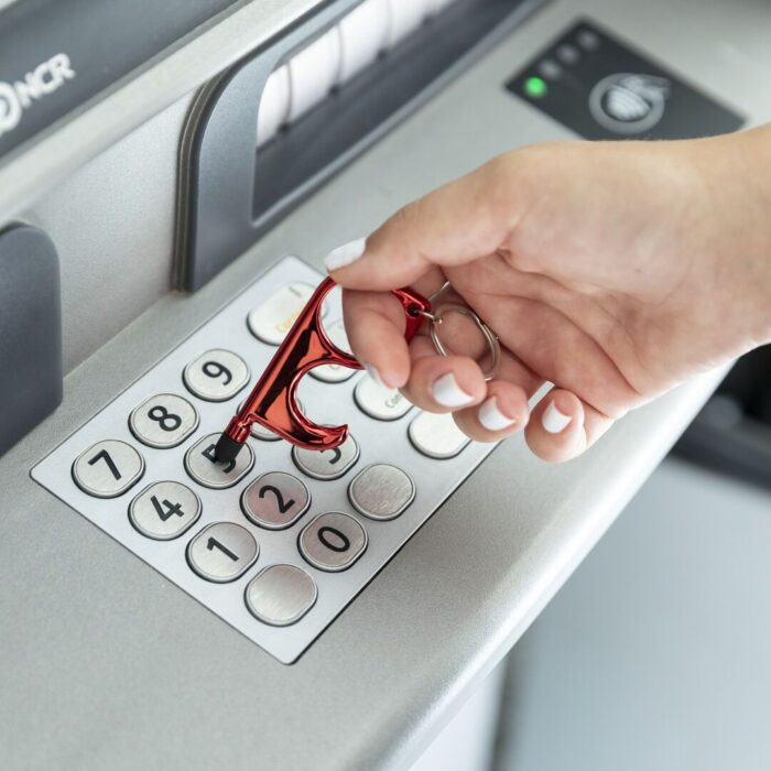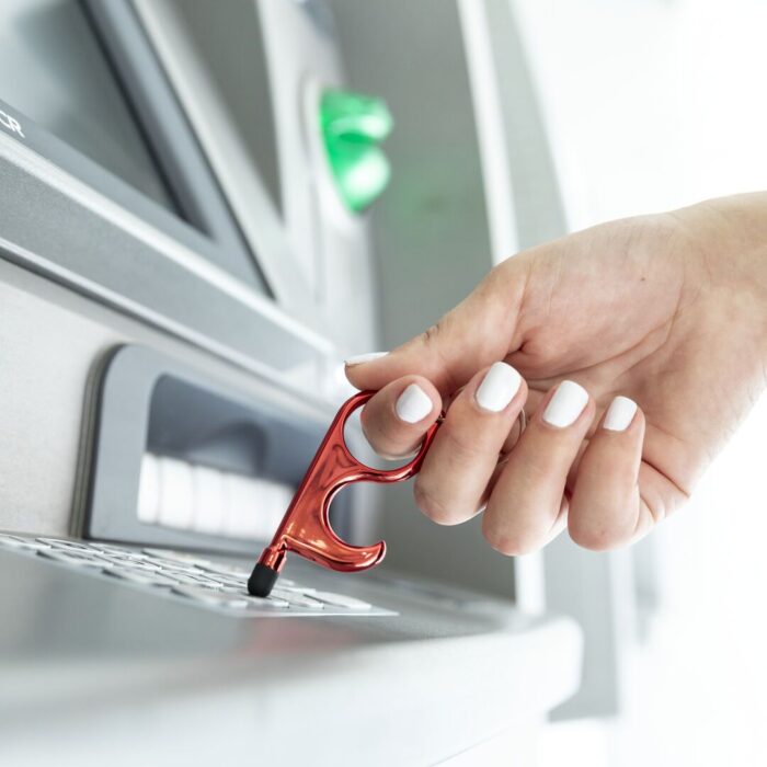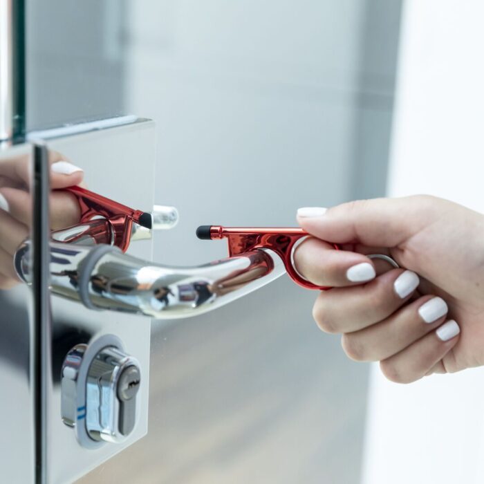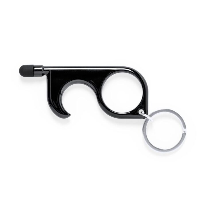 Llavero higiénico anti-contacto con bolígrafo y puntero integrados. Fabricado en resistente ABS de acabado metalizado y disponible en variada gama de colores. Especialmente diseñado para evitar tocar con las manos superficies de uso común (manivelas de puertas, interruptores, grifos de uso público, cajeros automáticos…). Con cómodo troquel para el dedo y presentado en bolsa individual de diseño. Recomendado para marcaje en tampografía.