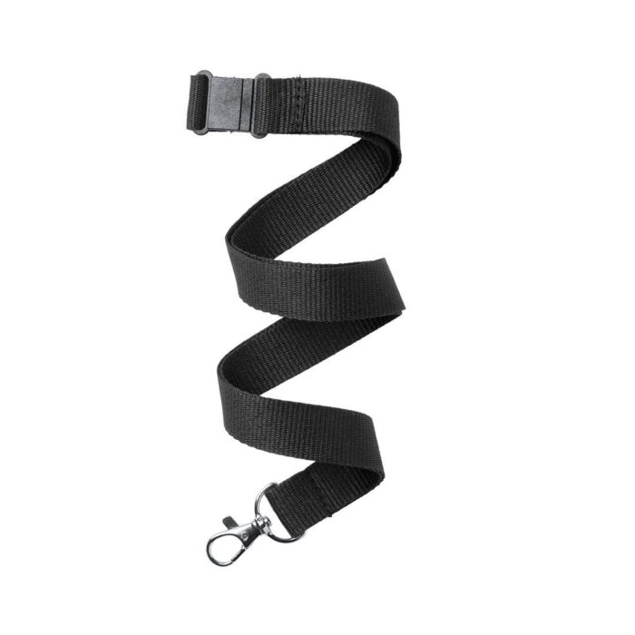 Lanyard en resistente poliéster, con accesorio de seguridad en el cuello y mosquetón metálico. Disponible en variada gama de colores vivos.