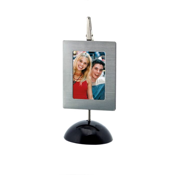 Portafotos de escritorio con clip portanotas metálico, marco imantado en acero inox y resistente base antideslizante en variados colores. Presentado en caja de PVC
