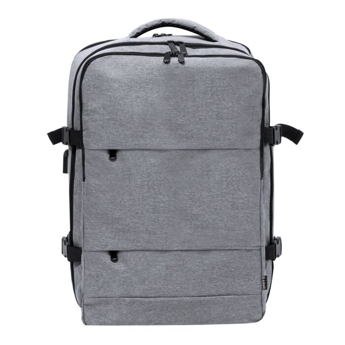 Mochila multifunción fabricada en 300D RPET. Elaborada con poliéster reciclado y resistente al agua, cuenta con una excelente transpirabilidad en la zona trasera, facilitando la disipación del calor gracias a sus cintas y respaldo acolchados. Las cintas anchas están diseñadas para aliviar la presión en los hombros, permitiendo llevar la mochila cómodamente durante largos periodos..Perfecta para cualquier situación por tener múltiples compartimentos: .2 bolsillos frontales. .3 compartimentos grandes centrales, uno de ellos portatodo, un bolsillo central de gran capacidad para guardad ropa y/o complementos con organizador en su interior, y un tercero acolchado, perfecto para llevar portátil de hasta 17,3 pulgadas. .Además, cuenta con 3 apartados especiales, un bolsillo lateral perfecto para tener acceso rápido, bolsillo para calzado en la base con argollas de ventilación, y bolsillo antirrobo en la espalda, además de cable USB. Perfecta para viajes o para el día a día por sus cintas ajustables, adaptándose a todo estilo de vida. Disponible en negro y gris, con logotipo RPET incluido. Presentada individualmente en bolsa reciclada..El material RPET se elabora a partir de plástico reciclado, para así fomentar la reutilización de residuos plásticos y ayudar a la sostenibilidad del planeta.